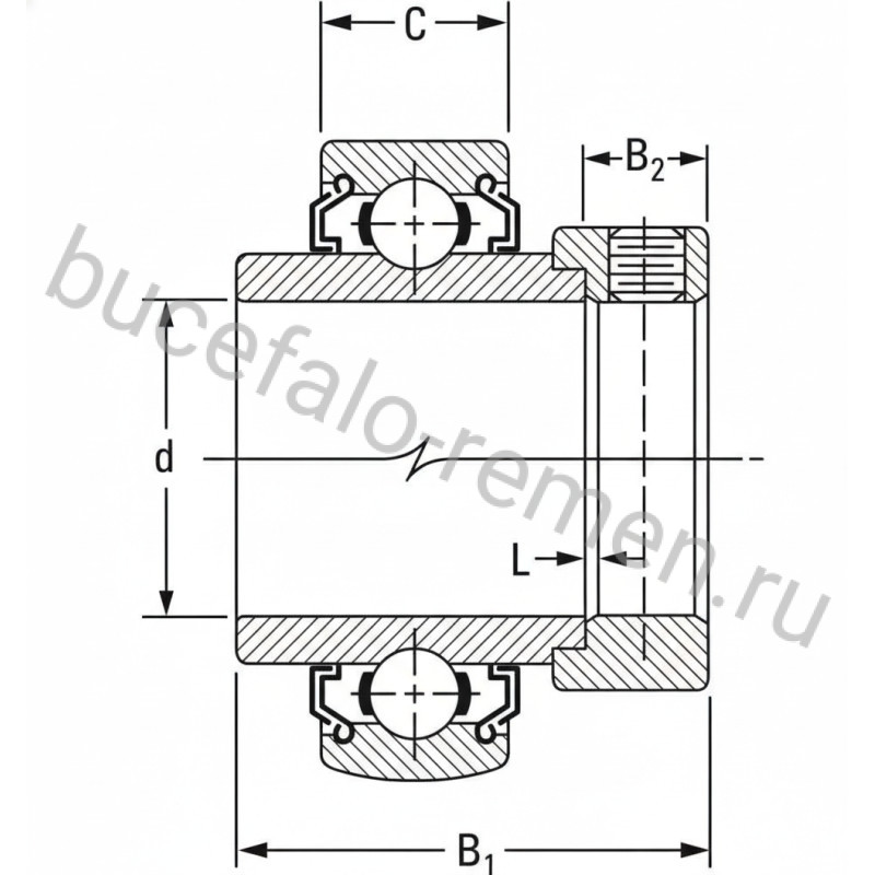 Особенность подшипника — эксцентричный выступ на широком внутреннем кольце, предназначенный для установки стопорного кольца. Закрепление на валу достигается поворотом стопорного кольца в сторону вращения вала и дополнительной затяжкой стопорного винта. Наружное кольцо имеет цилиндрическую поверхность. В конструкции используются стальные наружное и удлинённое внутреннее кольца с двух сторон, шарики и сепаратор из полиамида (пластика), а также две шайбы с одной стороны, изготовленные из оцинкованной листовой стали, которые выступают наружу во внешнем кольце. Между ними расположено промежуточное кольцо L-образного сечения, запрессованное на внутреннее кольцо. Подшипник подходит для работы при повышенных температурах и уменьшении трения. Смазочные отверстия отсутствуют, смазка заложена на весь срок эксплуатации. Рабочий температурный диапазон уплотнений варьируется от -20 до +100 °C, с кратковременным допуском до 120 °C. По уровню воспринимаемых нагрузок относится к стандартной серии согласно ГОСТ.