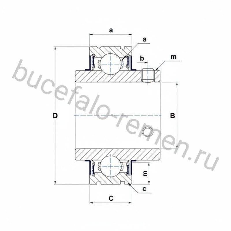Для крепления на валу используются два стопорных винта с шестигранной головкой, расположенные во внутреннем кольце под углом 120°. Наружное кольцо имеет цилиндрическую форму с двумя параллельными канавками для стопорных колец. В конструкции применены стальные наружное и внутреннее кольца (внутреннее удлинено с обеих сторон), шарики, штампованный стальной сепаратор, уплотнения и маслоотражательные кольца из листового металла. Уплотнения состоят из цельных шайб из оцинкованной стали с нанесённым снаружи вулканизированным резиновым слоем типа NBR (бутадиенакрилонитрильный каучук). Резиновый обод обеспечивает надёжное уплотнение при установке в наружное кольцо, а радиально нагруженная нижняя кромка препятствует выходу смазки через внутреннее кольцо и защищает от попадания загрязнений. Наружное кольцо оснащено отверстием для смазки. Подшипник уже заполнен смазочным материалом. Рабочий температурный диапазон уплотнений варьируется от −20 до +100 °C, с кратковременным допуском до 120 °C.