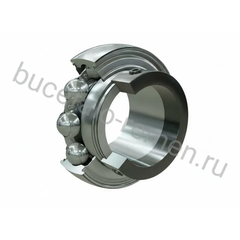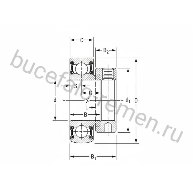 Внутреннее кольцо с широким сдвоенным выступом выполнено эксцентричным для установки стопорного кольца с чёрным оксидным покрытием. Фиксация на валу достигается за счёт поворота стопорного кольца по направлению вращения и дополнительного закрепления стопорным винтом. Наружное кольцо имеет сферическую форму. Конструкция включает стальные наружное и удлинённое с одной стороны внутреннее кольца, шарики, штампованный стальной сепаратор и уплотнения, состоящие из оцинкованных стальных пластин и бутадиенакрилонитрильного каучука (NBR) с повышенной прочностью. Уплотнение располагается за защитной кромкой и обладает предварительным осевым натягом. Отверстия для смазки отсутствуют, подшипник заполнен смазочным материалом на весь срок эксплуатации. Температурный диапазон работы уплотнений составляет от -20 до +100 °C, с кратковременным повышением до 120 °C. Размеры указаны в дюймах.