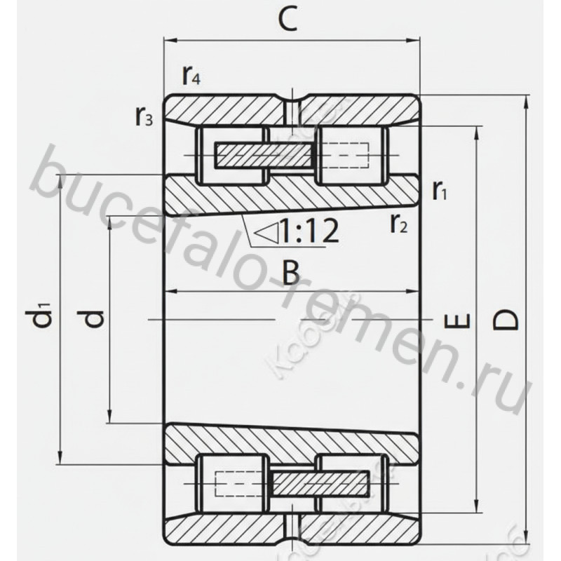 Разъемный подшипник с наружным безбортовым кольцом с канавкой по центру и отверстиями под смазку и внутренним кольцом с отверстием под конус, тела качения цилиндрические ролики, которые удерживаются механически обработанным текстолитовым сепаратором на каждый ряд. Могут применяться при температуре от -40 °C до +120 °C. Воспринимает только радиальную нагрузку.