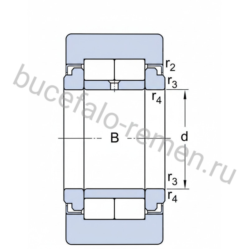 Радиальный роликовый подшипник с короткими цилиндрическими роликами, выполненный в двухрядном исполнении. Опорный ролик создан на базе двухрядного цилиндрического роликового подшипника без сепаратора и без борта между наборами роликов. Наружное кольцо имеет два борта, обеспечивающих осевую фиксацию роликовых комплектов, а внутреннее кольцо оснащено двумя свободными фланцевыми кольцами, которые фиксируют наружное кольцо в осевом направлении, ограничивая движение роликов. Фасонные кольца из листового металла, запрессованные в заплечики наружного кольца с обеих сторон, формируют лабиринтное уплотнение, расположенное поверх фланцевых колец, что придаёт опорному ролику неразъёмную конструкцию. Данный подшипник способен воспринимать значительные осевые нагрузки, возникающие из-за перекоса или опрокидывающих моментов.