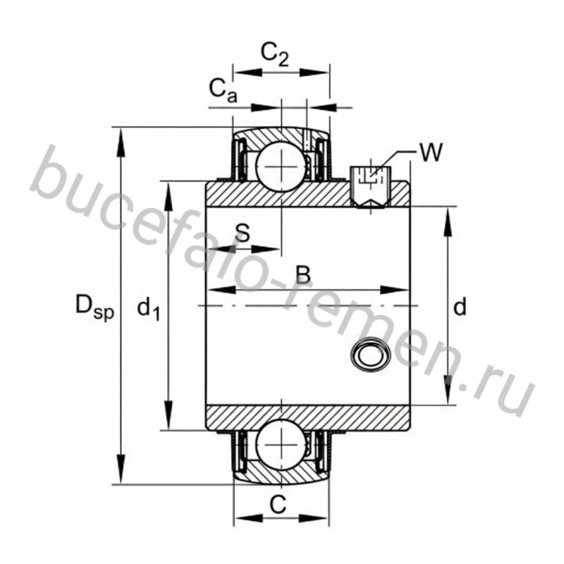 Шариковый корпусной подшипник FBJ закрепляется на валу с помощью двух стопорных винтов с шестигранной головкой, расположенных во внутреннем кольце под углом 120° друг к другу. Наружное кольцо имеет сферическую форму. В конструкции используются стальные наружное кольцо и внутреннее кольцо с удлинёнными с обеих сторон частями, шарики, штампованный стальной сепаратор, уплотнения и маслоотражательные кольца из листовой стали. Уплотнения состоят из цельных шайб из оцинкованной листовой стали с вулканизированным снаружи резиновым покрытием типа NBR (бутадиенакрилонитрильный каучук). Эластичный резиновый обод обеспечивает надёжное уплотнение при монтаже в паз наружного кольца, а нижняя кромка, нагруженная радиально, препятствует вытеканию смазки через внутреннее кольцо и защищает от попадания загрязнений. В стандартной комплектации присутствуют смазочные отверстия на наружном кольце. Подшипник поставляется с заводской смазкой. Температурный режим для уплотнений варьируется от -20 до +100 градусов.